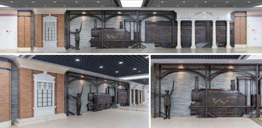 地鐵六號(hào)線工業(yè)文化主題站-復(fù)興路站《鐵路風(fēng)云-龍?zhí)枡C(jī)車》浮雕墻